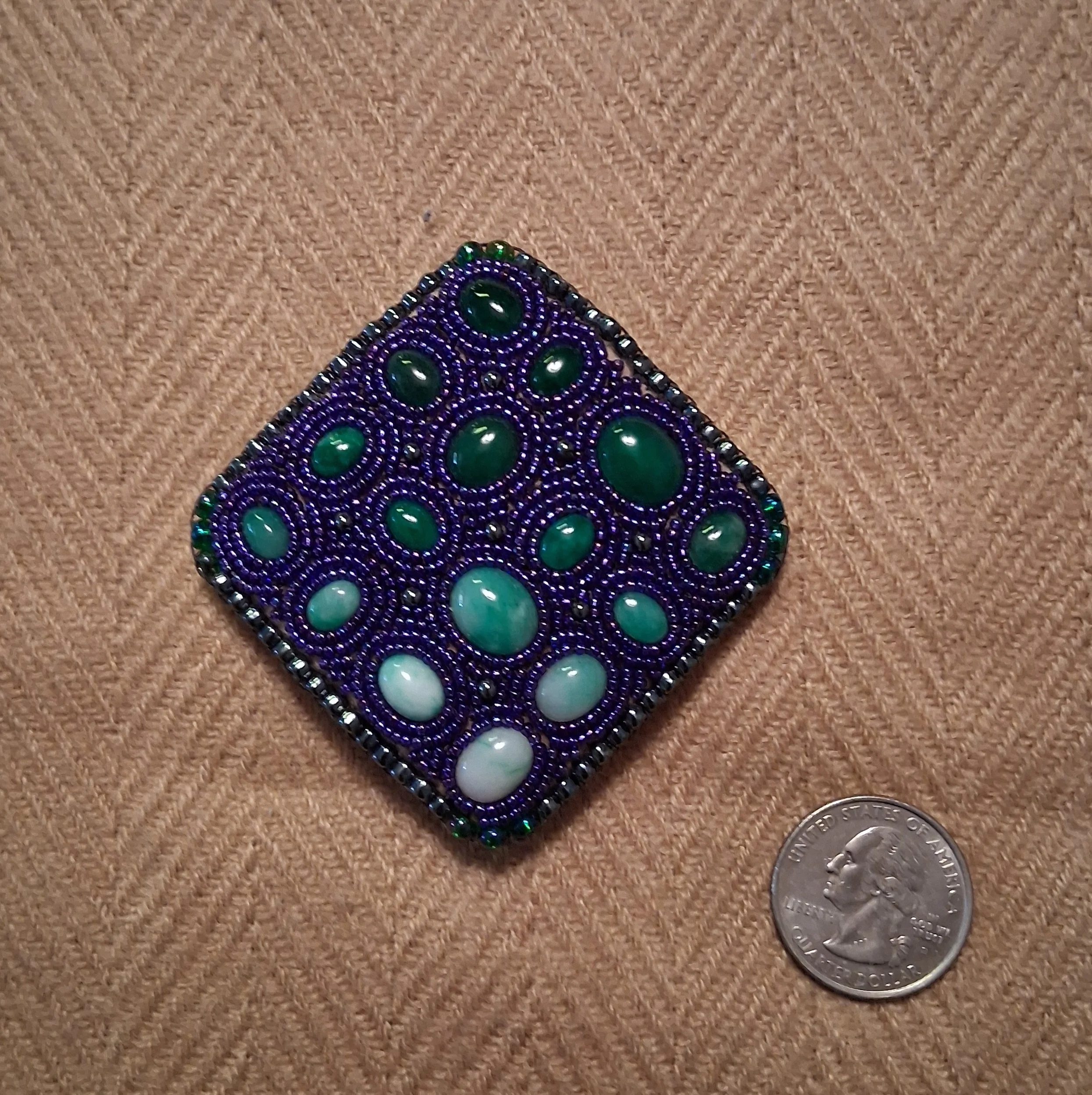 Minty Pebbles brooch made with stone cabachon, hematite and glass beads. Lovingly stitched with corner details.