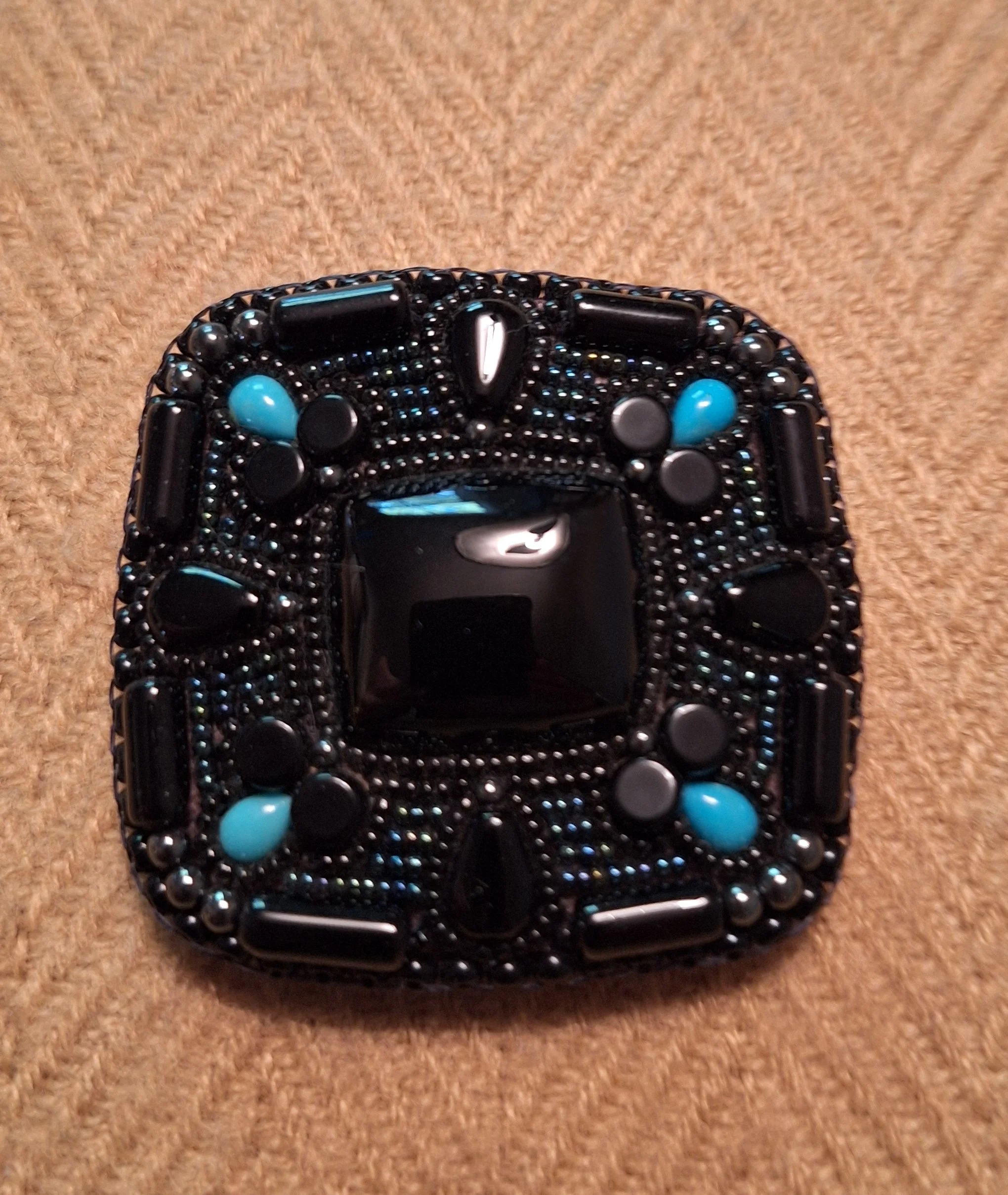 Black Onyx brooch made with a beautiful square Black Onyx cabachon with Turquoise teardrops and glass beads.